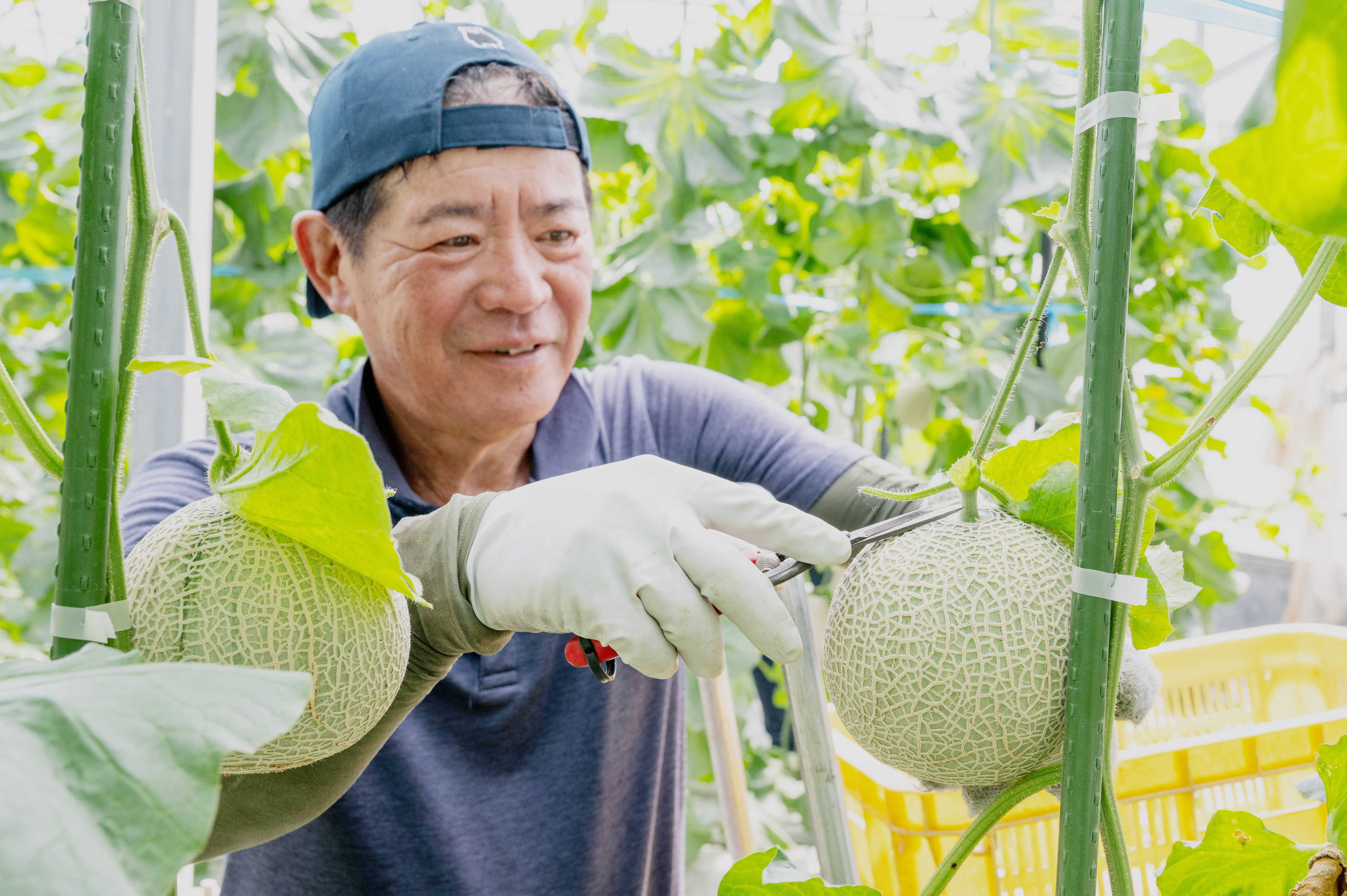 秋冬メロンであるアールスメロンは夏にぐんぐん成長するため、暑い時期の作業は一苦労。減農薬・化学肥料にも積極的に取り組んでおり、虫が付かないように目が離せないのです。また、アールス以外のメロンも、収穫後から次の栽培までの初夏の間に、連作障害が出ないようにするための土作りの作業が不可欠。生産者たちは、メロンという「夢ある果物」をお届けするために、日々努力と工夫を重ねています。