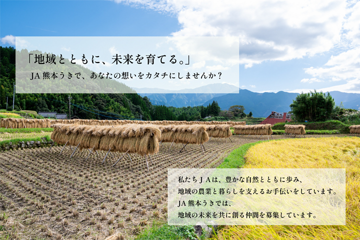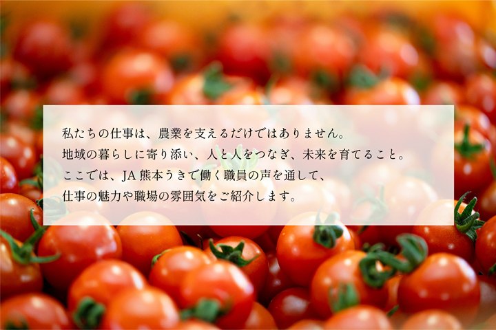私は富合支所で金融の窓口を担当しています。幼い頃から、祖父母とJAのイベントに参加したり、直売所の『サンサンうきっ子』を訪れていた私にとって、JAはとても身近な存在でした。