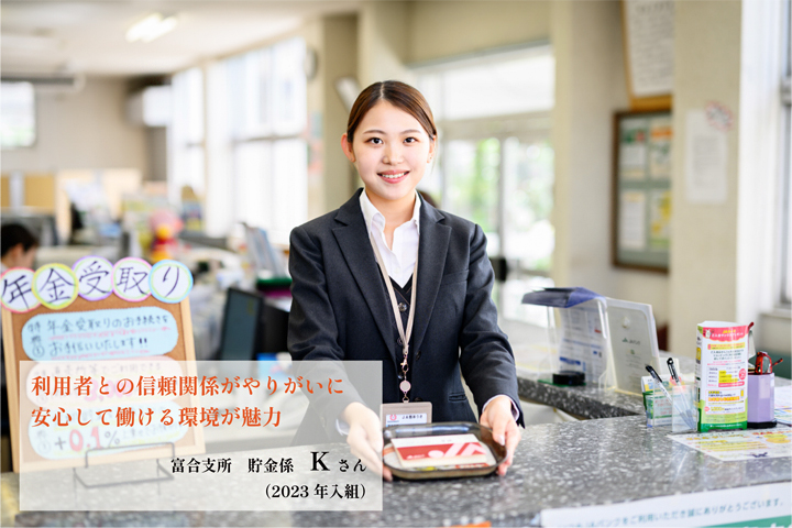 窓口では、お客様と顔を合わせることで、地域の方の生活を支えていることを実感します。お客様との間に信頼関係を築き、お礼の言葉を頂けた時には、特にやりがいを感じます。